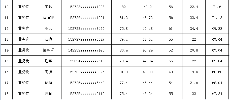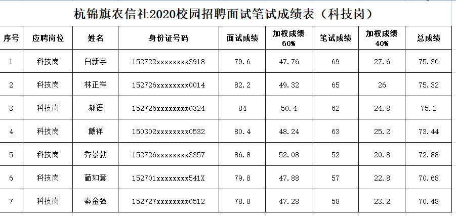 根據(jù)《內(nèi)蒙古自治區(qū)農(nóng)村信用社聯(lián)合社2020年轄區(qū)法人機(jī)構(gòu)應(yīng)屆高校畢業(yè)生校園招聘通知》要求,杭錦旗農(nóng)村信用合作聯(lián)社2020年度校園招聘筆試面試全部結(jié)束,現(xiàn)將成績(jī)公告如下: