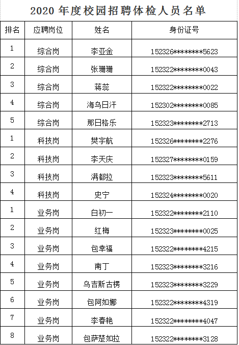 根據(jù)《內(nèi)蒙古自治區(qū)農(nóng)村信用社聯(lián)合社2020年轄內(nèi)法人機(jī)構(gòu)應(yīng)屆高校畢業(yè)生校園招聘工作的通知》要求,按照筆試與面試5:5的比例加權(quán)計(jì)算出總成績(jī),排名由高到低確定進(jìn)入體檢環(huán)節(jié)人員,綜合崗5人、科技崗4人、業(yè)務(wù)崗8人。如有自動(dòng)放棄或體檢不合格的情況,將按報(bào)考崗位成績(jī)由高到低的順序遞補(bǔ)?,F(xiàn)將體檢工作有關(guān)事項(xiàng)通知如下: