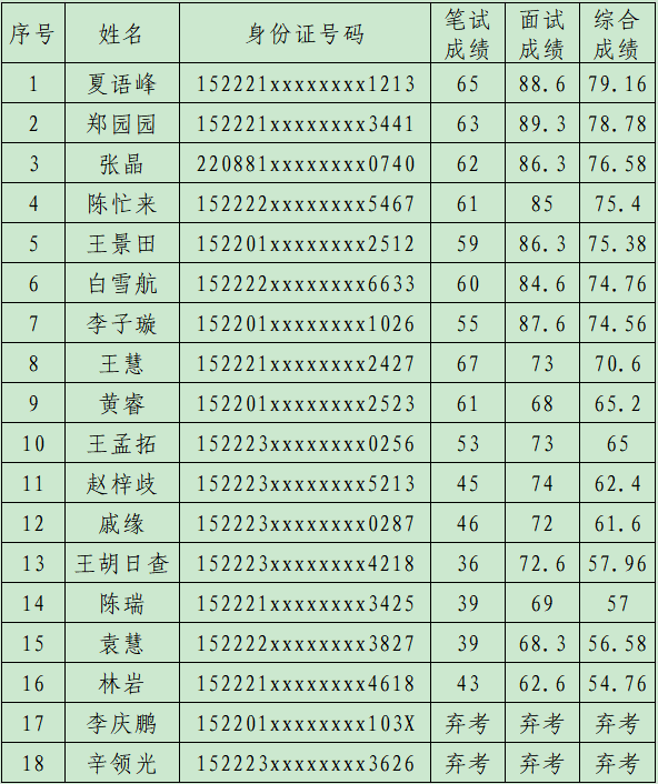 按照2021年度資源型人才引進(jìn)工作的具體要求,2021年6月19日-6月20日,科右前旗農(nóng)村信用合作聯(lián)社委托第三方機(jī)構(gòu)圓滿完成了資源型人才引進(jìn)人員筆試、面試工作。現(xiàn)將參考人員按筆試與面試4:6比例加權(quán)計(jì)算的總成績予以公告。