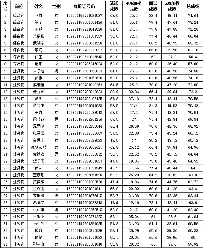 根據(jù)《內(nèi)蒙古農(nóng)村信用社2019-2020年度全區(qū)法人機(jī)構(gòu)應(yīng)屆高校畢業(yè)生校園招聘簡(jiǎn)章》要求,2019年12月1日,烏蘭浩特市農(nóng)村信用合作聯(lián)社圓滿完成了2019-2020年校園招聘面試工作?,F(xiàn)將面試人員按筆試與面試4:6比例加權(quán)計(jì)算總成績(jī)予以公布(詳見附件)。