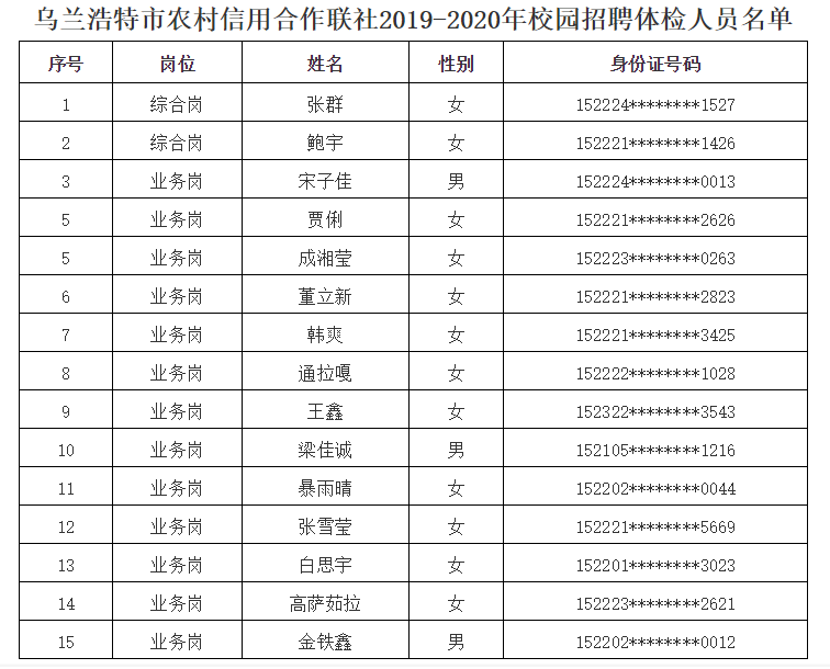 附件:烏蘭浩特市農(nóng)村信用合作聯(lián)社2019-2020年校園招聘體檢人員名單