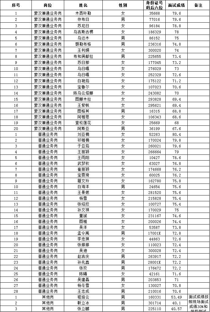 克什克騰農商銀行委托內蒙古如保誠人力資源管理有限公司組織完成了本行2019-2020年應屆高校畢業(yè)生校園招聘面試工作,本次面試最終共61人參加,其中蒙漢兼通業(yè)務崗考生24人、普通業(yè)務崗考生34人、其他崗籃球專業(yè)3人。根據(jù)首次開考比例須達到招聘計劃1:3的比例要求,最終確定招聘蒙漢兼通業(yè)務崗8人、普通業(yè)務崗11人、其他崗籃球專業(yè)1人。根據(jù)自治區(qū)聯(lián)社文件要求,結合本行實際招聘崗位計劃,在面試結束后按照招聘崗位的1:2.5的比例確定入圍筆試人員,現(xiàn)將入圍筆試人員名單及成績進行公告。
