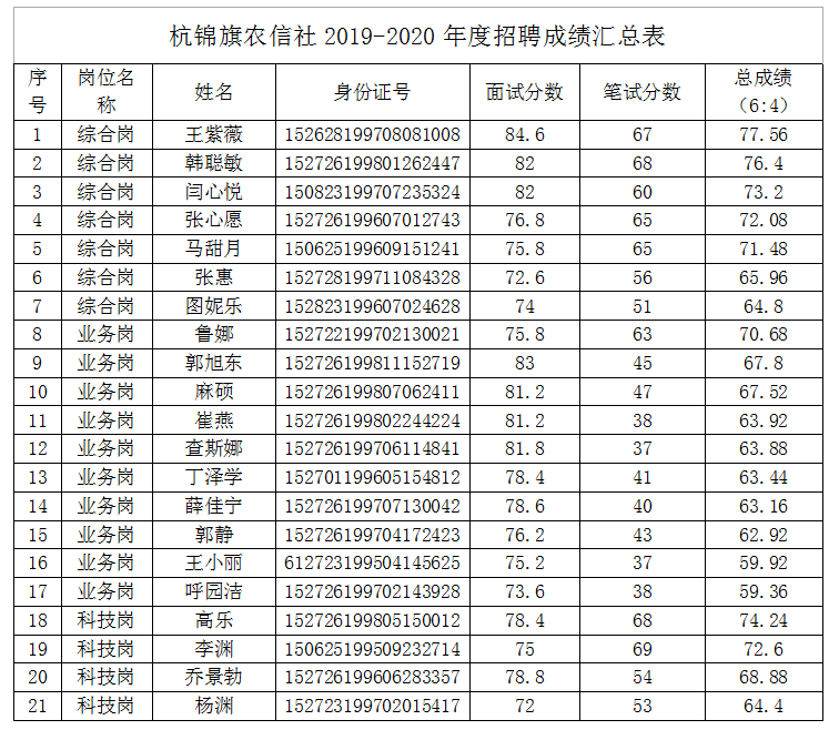 根據(jù)《內(nèi)蒙古農(nóng)村信用社2019-2020年度全區(qū)法人機構(gòu)應(yīng)屆高校畢業(yè)生校園招聘簡章》要求,杭錦旗農(nóng)村信用合作聯(lián)社2019—2020年度校園招聘面試筆試全部結(jié)束,現(xiàn)將成績公告如下: