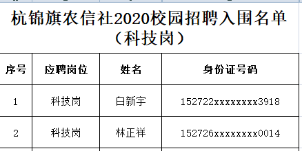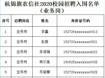 根據(jù)《杭錦旗農(nóng)村信用合作聯(lián)社2020年應(yīng)屆高校畢業(yè)生校園招聘工作方案》要求,杭錦旗農(nóng)村信用合作聯(lián)社2020年度校園招聘面試筆試全部結(jié)束,招聘計(jì)劃為:綜合崗3人、業(yè)務(wù)崗5人、科技崗2人。