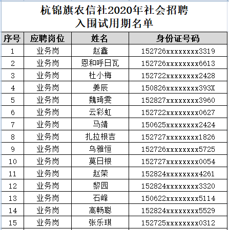 根據(jù)《杭錦旗農(nóng)村信用合作聯(lián)社2020年公開招聘公告》要求,杭錦旗農(nóng)村信用合作聯(lián)社2020年社會招聘面試筆試全部結(jié)束,本次招聘計劃為:業(yè)務(wù)崗10名,其中按1:1.5比例入圍試用期,即入圍試用期人員15名,試用期滿后按照考核排名錄取前10名。